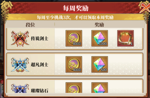 2、每周奖励为循环奖励,每赛季参与过3次及以上挑战的玩家在新赛季开启并重置段位时,可在玩法界面领取。