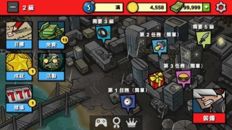 2、玩家们过关之后可以获得一定的金币,利用那些金币来给自己升级的话可以让我们的角色获得更多的属性加成,这样在后期的时候消灭那些僵尸就更加轻松了,我们要注意正确的方法。