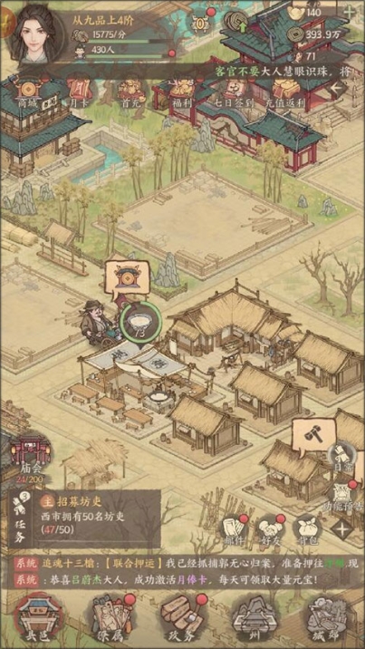 这款城市游戏名为“九游渠道版”,是一款创新的古典风格模拟经营游戏。它采用了治愈系的水墨画风。在游戏中,你将成为隅边镇的一方小县令,承担起复兴城镇的责任。你可以开垦荒地、耕种农田、管理店铺,促进城镇的繁荣,维护治安,提升居民的生活水平。