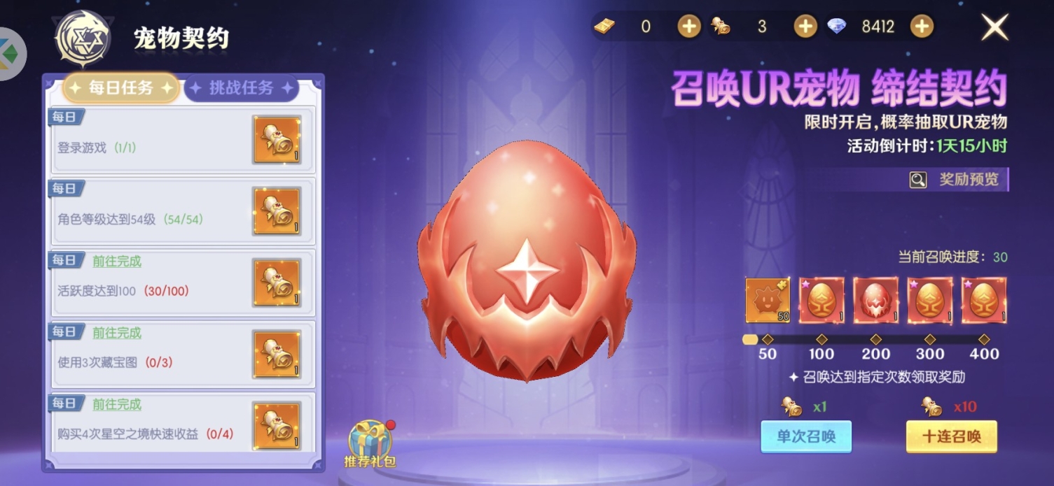 宠物系统和云上城可以说一模一样,前期不用过于追求UR,因为获取相对较难,而且一只两只没有多大效果。因为宠物需要升星,升星就需要宠物本体,没有本体就无法培养。所以平民玩家还是选择SSR的宠物来培养,体验会好很多,(氪佬无视,干就完了)。宠物可以上阵三个技能,建议选择回血+攻击+护盾,万金油组合,打本和竞技都好用。
