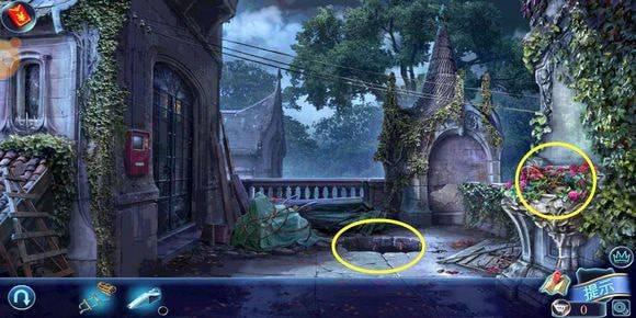 4、继续返回场景2露台,用凿子和锤子砸开墙壁上的土,用手套拾取“嵌片”,还有一个“把手”。这时候场景2露台上的全部线索搜完了,还剩一个场景1汽车里面特殊的按钮。