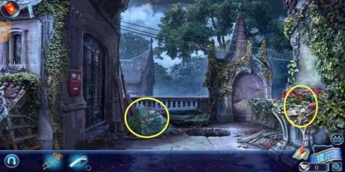 5、用橡胶手套拨开花坛上的荆棘得到一张“乐谱”,用小铁锹铲土得到一个“三角形的电源按钮”。