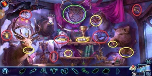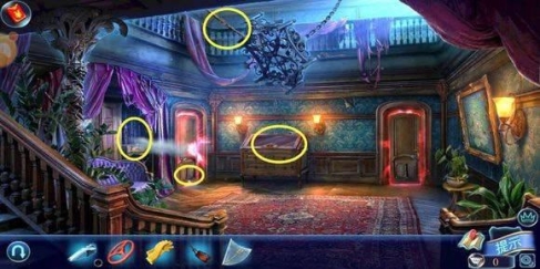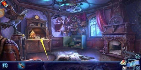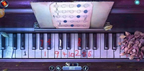 1、点击钢琴,放上乐谱,按提示按下相对应的琴键,钢琴差一个踏板。退出画面,发现墙壁盾牌下面的暗格打开,得到“油壶”。回到场景2用油取下杂物堆的“螺丝刀”,再继续返回场景1用螺丝刀取下小木屋的“徽章”。