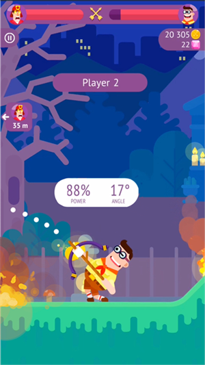 游戏的画面表现还算不错,在操作上则采用了经典的弹射方式,有些类似《愤怒的小鸟》一样,玩家们随意按住屏幕主角周围区域,然后向后拖动手指即可出现反弹能量值以及角度值,当玩家们放开手指的时候,手中的武器就会直接射出去了。本作操作起来很简单,而且还为玩家们标注好了能量和角度,这都便于玩家们更好的控制自己的射击准确度。