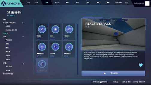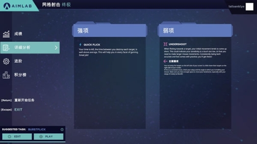 清楚自己的大概情况之后,可以挑自己的弱项去练习一些基础的项目,分数有明显长进之后再练习进阶项目。而自己比较强的项目,也可以去挑战进阶项目更高的分数。另外AimLab会根据练习结果,将弱项列出并且推荐一个可以帮助提升相关能力的项目。在练习的同时,要不断反思自身出现的问题,对症下药才能达到最好的效果。
