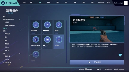 如果分数每次都能稳定在80000左右就可以尝试一下进阶的项目(如果分数太低不建议练习进阶项目,效果很差)。AimLab中比较热门的定位项目是六目标射击:可以理解为网格射击的进阶版,目标从三个变成了六个,而且目标更远,更小了,难度大大增加。以csgo中第一回合的手枪战为例,定位能力的高低在这个时候能很好的体现出来,六目标射击的练习对于csgo玩家来说至关重要,对远距离微小目标的定位能力强,就可以打出八百里开外沙鹰一枪头这种操作。