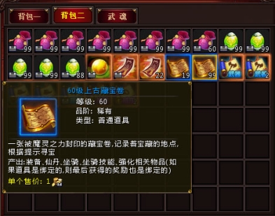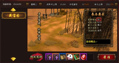 等大家在游戏里升级到30级后,就可以开始藏宝图活动了!1、点开游戏右上角装备图标,可以看到藏宝图活动的详情,单人任务,每天可以挖10次。除了活动本身提到了奖励,藏宝图还会很高几率产出各职业仙丹,所以大家记得每天挖够次数哦!
