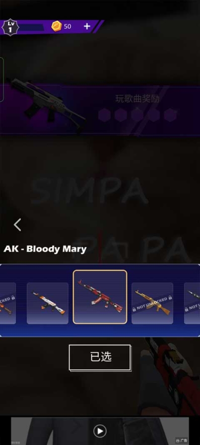 6、选择好歌曲之后,选择接下来射击用的枪支皮肤,选好后进行下一步。