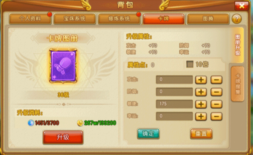游戏内消耗卡魂(卡魂可以自秘境商店中兑换,或邀请新人加入弹弹世界获得的礼包内也有卡魂)和一定数量的金币进行图册升级,可以获得属性点,弹友们可以按照自身需要将属性点投入到自身所需的属性上,再次进行一波提升。