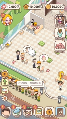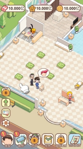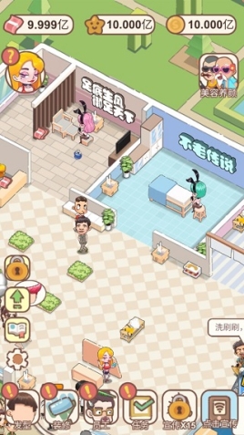2、大概解锁玩所有的理发台之后,我再解锁其他的装饰 ,像洗足 ,小费台等,获得少量现金的地方,每一次最多能让10个客人排队,但是场地又不可以收缩,限制了视野。现金还是直接丢在地上,要不停的点击,一旦你退出游戏,就代表整个生产都停止了。没有员工是自动为你剪发,每一次都要点,好像在催他一样。