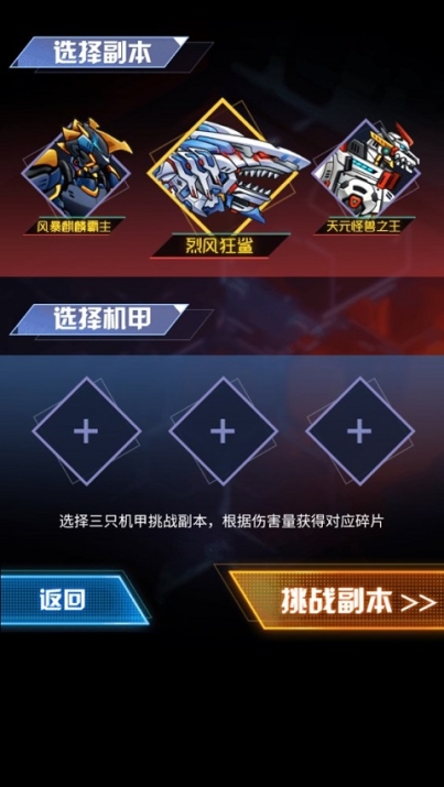 游戏里碎片是解锁机甲的重要资源,除了在竞技场有几率获得碎片以外,更多是要挑战每日副本。每日副本提供了很多稀有机甲,选择三只机甲挑战副本,根据伤害亮获得对应碎片。