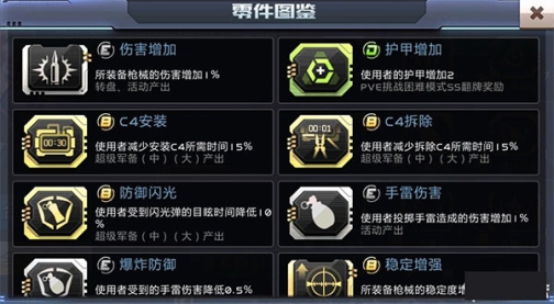 《全民枪战2》中的零件共有13种可分为3类:武器强化:【提升伤害】【生化攻击】【更加稳定】【手雷威力】【扩大射程】【减轻重量】【专家打击】