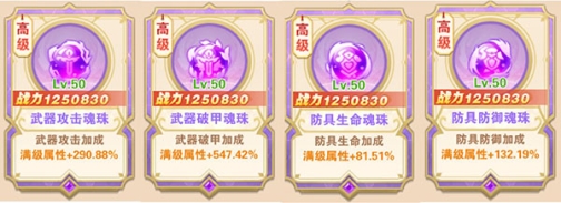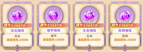 我们现在拿最容易获得的紫色魂珠做对比,分别是下图红色框中的攻击、破甲、生命、防御魂珠。这几个魂珠满级战力是23.6W战力