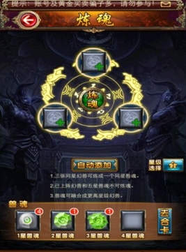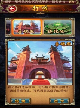 与聚义厅也是相同的,只不过幻兽是不能指定合成的,只能随机合成一个更高一级的幻兽。每次合卡需要用三个相同星级的兽魂就可以生成一只更高级的幻兽。