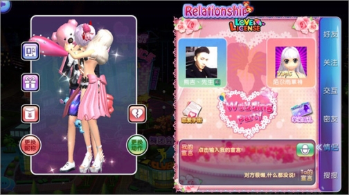 4、成为好友或者密友后,通过养成“友好度”或“亲密值”,可以申请成为“情侣”喔!成为“情侣”后,通过结婚,开启夫妻系统!成为夫妻后,不仅可以更换对方的专属昵称,还能设定专属动作呢!哦,对了!还有神秘的“情侣奖励”可以领取喔!当“婚龄等级”提升后,还能解锁专属的合成服装呢!心动不如行动,快去寻找让你心动的Ta吧。劲舞时代华游戏玩法介绍