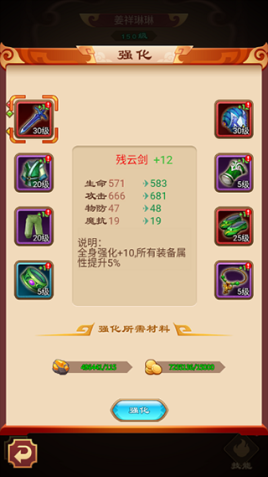 只有休闲怎么行?帮派,竞技,仙圃,姻缘系统让你眼花缭乱;更多元素的结合,让你在闲暇之余体验非一般的感觉!功能介绍-强化