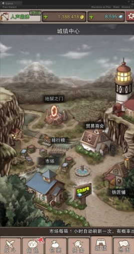1、城镇中心介绍在游戏的“城镇中心”玩家可以看到“市场”、“铁匠铺”、“排行榜”、“地狱之门(目前暂未开放)”等等。