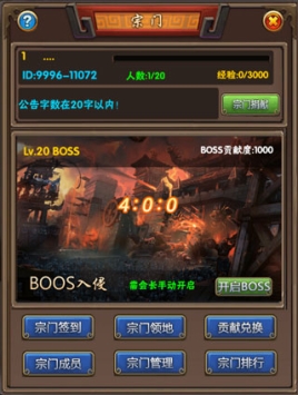 门派每天提供两次免费挑战boss的机会,用完这两次机会后,则需使用活跃值来开启boss挑战,仅会长有例外。