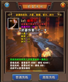 装备洗练分为: 普通洗练:需要金币,高级洗练:需要钻石