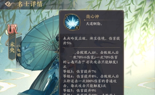 敛心神(被动技能):未央获得6%的伤害提升,击败敌人后会有一定概率追击一次普攻(每回合限追击一次)。