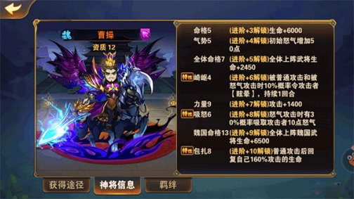 特性10包扎,普攻回复160%血量,后期按5万攻击来算的话,能回8万血,可以说回的非常多。而且只要不被控制,几乎很稳定,大大增加了曹操的生存能力。