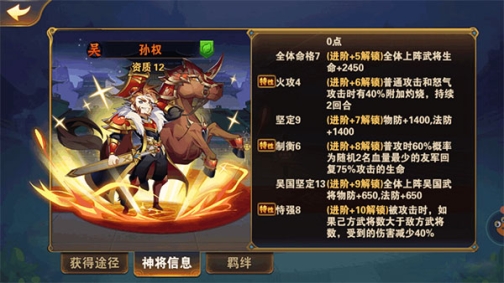 特性8,普攻60%几率给血最少的2个队友回复75%攻击血量,很多吴国觉得这个不好,其实不然。首先60%几率不算少,触发方面还是可以的。且回复血最少队友,也能保证生存率。而75%*2=150%,比起刘备大招也就少90%。而且关键是回血集中。有些人会说刘备回血稳定,但是刘备需要开大才能回,而孙权普攻就有几率触发。总的来说,这个特性是很不错的。