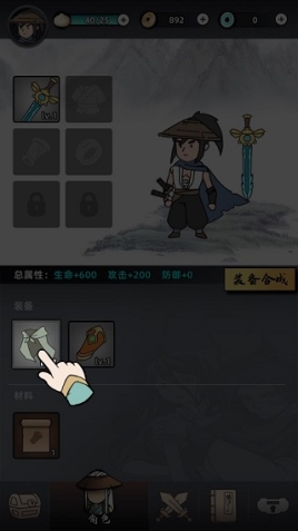 当然,作为一款以武侠为题材的休闲闯关游戏,装备的升级对于角色战力的提升有着非常大的帮助,回到主界面,点击“角色”系统,可以将以获取到的装备进行穿戴,甚至你还能将闲散的装备进行合成。