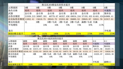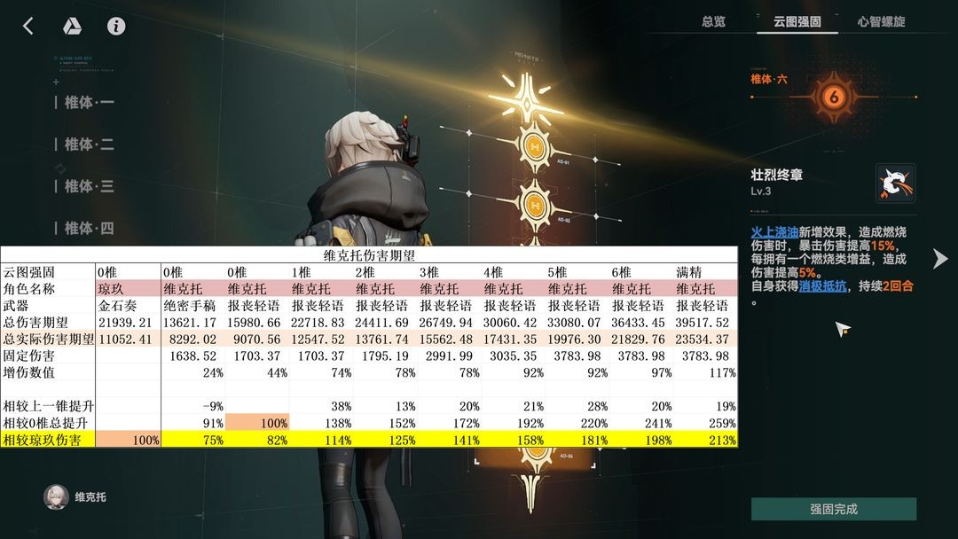 接着就是维克托的增伤能力,这里分别计算了两组数据,分别是对于0+1琼玖和6+6琼玖的提升幅度,要注意我这里计算的是总提升,而不是全部对标0椎琼玖。0椎维克托可以为全队提供平均25%的燃烧属性增伤,但是更大的提升在于提供多一次的支援次数,这个提升对维克托自己也是生效的。0椎维克托就可以为琼玖提供约35%的总伤害提升,但是更大的贡献在于属性克制的破稳能力提升。
