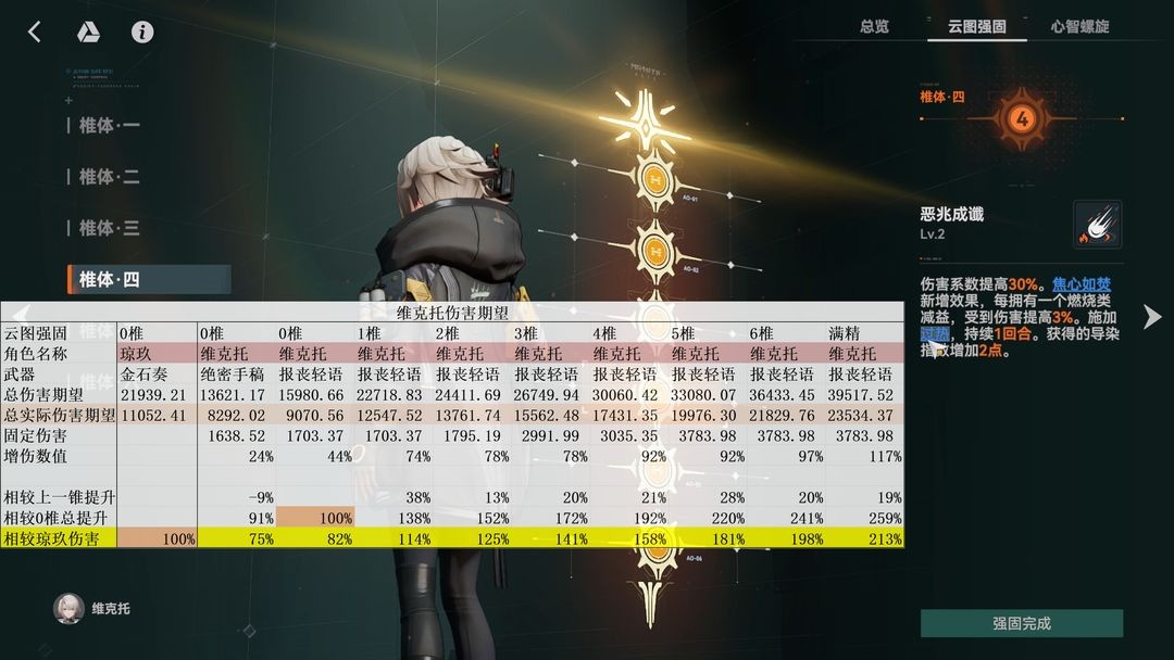 3椎:增加1技能的倍率,还有额外的【过热自燃】效果,大家可以注意到这次的伤害期望里有一行写的是固定伤害,这里是平均下来每回合的固定伤害,可以看到3椎时回合均固定伤害已经来到了近3000点,占到了输出的五分之一,非常夸张。这里也整理了一下维克托能够造成的固定伤害倍率:一技能80%+被动和一技能的两次过热自燃20%x2+地格和一技能的两次溢火结算伤害10%x2,共计140%倍率的固定伤害(1技能CD的回合会较低,这里3000算的是平均),这还没算大招給友方附加的固定伤害,我只能说,肥肠滴恐怖。