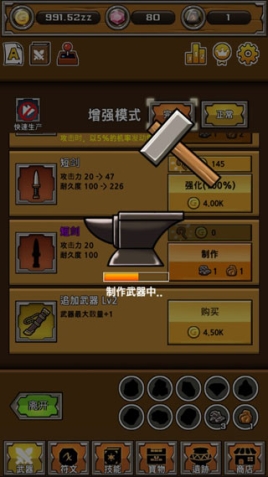 3、由于该游戏采用的自动放置战斗玩法,因此玩家只需关心装备的打造过程就可以了,但为了玩家考虑,小编在此也说明一下,游戏中有着丰富多样的关卡挑战,而且逐级递增的怪物数量会增加你的挑战难度,另外还需注意的一点就是武器的耐久性,每种武器被锻造出来以后都是一次性作战,耐久为0时,则需要更换另一套武器。