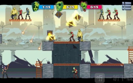 3.游戏的最大亮点是玩家可以用子弹杀死僵尸,还可以通过物体的间接碰撞来摧毁僵尸。