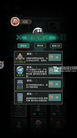 点击右上角的蜜獾商店,在里面不断升级自己的属性,这样可以让玩家在下次游戏的时候可以获得额外的攻击以及防御属性,这样就可以轻松的面对猛鬼的攻击了。