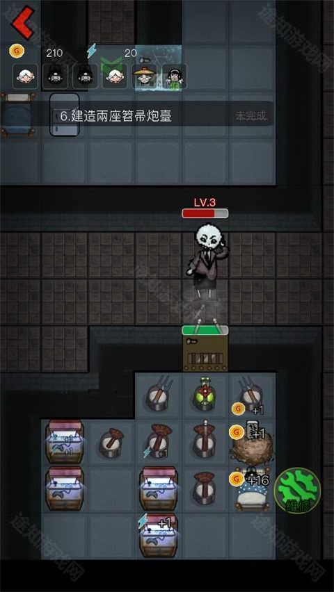 4、我们可以在门旁边放4个炮台,如果鬼来的快则可以优先购买炮台,并且刚开始鬼等级很低,我们炮台伤害很高。
