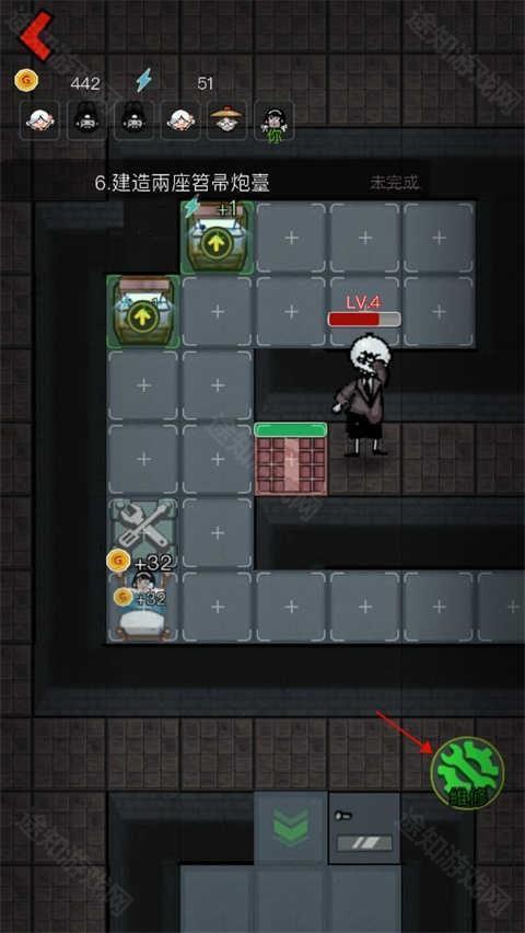 7、当它过来挠3你门的时候可以将门和小床不断的升级,这样即便没有道具它也挠不开,当门被挠了掉血的时候,玩家还可以点击下方维修按钮进行维修;