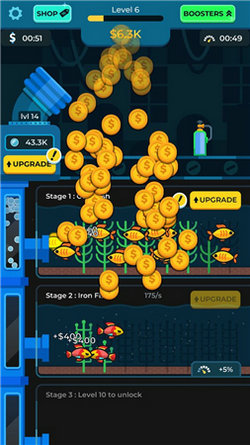 1、完成日常任务和售卖鱼类后,你将获得金币,用于购买更高级的鱼种和道具,提升你的经营效率。