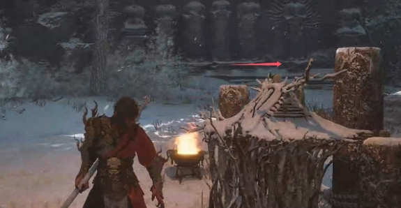 1、来到极乐谷-罪业塔林,面对火把位置,如图所示,走到塔前面。
