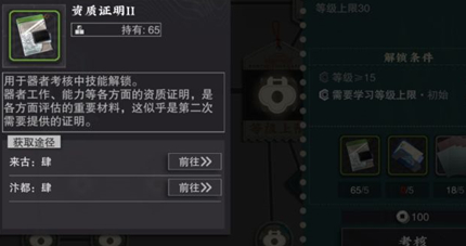 考核需要资源种类较多,资质证明为通用材料,所有角色升级都会需要。对应职业需要对应的核定书和其他材料。若不清楚材料在哪里获取,可以点击需要的材料图标,会显示材料获取途径。