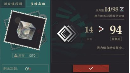 活力储存上限会随着账号等级提升而提升,活力在没有存储满的情况下,活力每8分钟自然恢复1点,活力在存储满之后不再自然恢复(使用活力药水或者直接购买活力,这个情况下活力可以超出存储上限)。60多棱灰珀可以购买80活力,每天只能购买三次。零食答礼活动每天会赠送30活力药水。