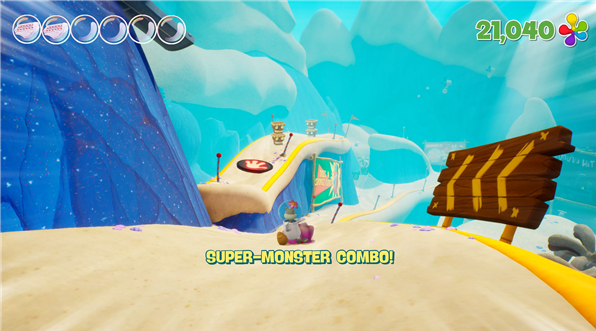 开始滑动后不久,您将看到带有按钮的叉子。按下按钮,然后立即减速,按住S并等待。该按钮会生成一个巨大的巨石,它将撞成巨大的雷电tiki和另一只正常的tiki墙。这是您对象的最大来源。放慢速度,直到那两堵大墙的所有物体都飞到您身上,然后跳下坡道并重设自己。