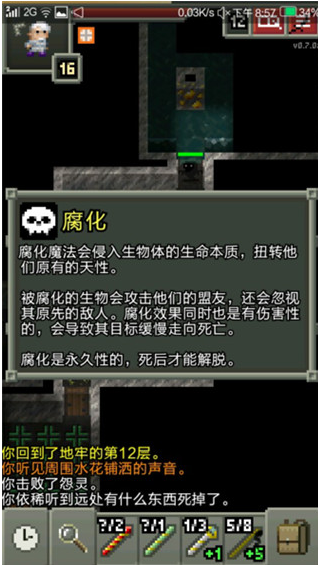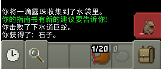左上方框中为头像,头像框右下数字为等级,右方长条条是血条,头像黄色闪烁提示有未使用的天赋点。头像呈红色闪烁提示血量低该考虑回血了(露珠、回春草、治疗药剂、催眠卷轴)。点击头像可查看当前属性、状态,选择天赋。状态也会在血条下面显示图标,包括各种增益、负面状态及剩余回合数。