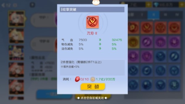不朽品质的纹章可突破,突破后能大幅提升基础属性。纹章分为攻击型、防御性、辅助型,不同类型的纹章突破需要消耗不同的铭文材料。突破后纹章品质变为T1,再次突破则变成T2。镶嵌2件同名T1级纹章后增加2件套T1效果:额外全能+5%;镶嵌4件同名T2级纹章后增加4件套T2效果,效果额外增加,根据原有4件套效果变化