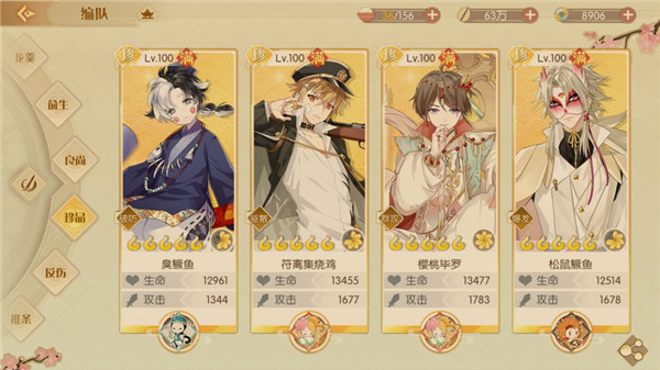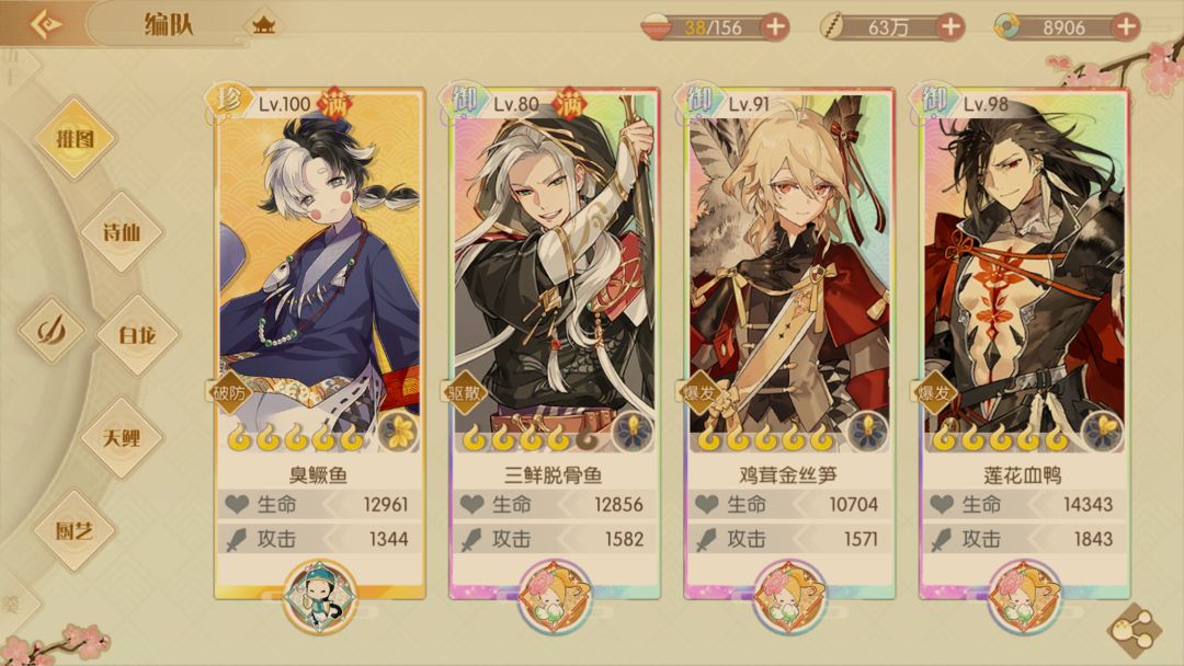 这套纯珍品阵容,前三个必养,松鼠纯粹是因为喜欢,可以换别的。这套主要用来打水月阁,阿符的驱散是真的好使。