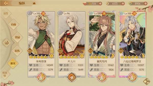 这个队伍现在用的少了,一些新人我还是会推荐的,获取相对容易。第一回合八仙推条,第二回合片儿川推条,第三回合一品推条,然后就没有然后了。