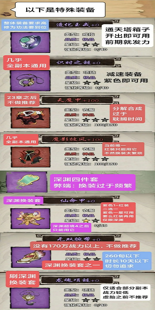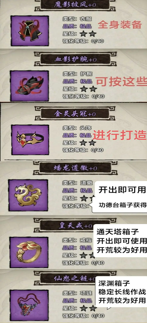 当前热门装备包括头冠、魔影、血影、蟠龙等。后期装备需根据紫色装备的抽取情况进行分解与再造。戒指与项链方面,箱内随机获取的如“造化玉戒”等效果亦佳,无需强求。主流武器有天焱剑,若易得雷罚,可用其过渡至橙色三级。其他武器建议分解或合成橙色后分解