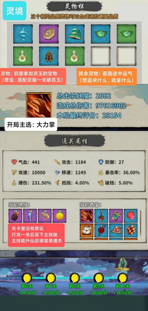 2.灵物:前期道路上,优先选择能增加灵玉的宝物。若你已达到婴变期,想必奇宝灵猫已入你手。关卡结束后,记得在商店中购入灵猫,后续依据你的合成需求,选择相应的灵物进行收集。当身上的灵玉累积到一定程度时,务必在第二次购买灵猫前后进行消费。