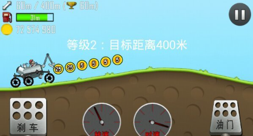 当你第一次玩这个游戏,因为登山赛车内置菜单刚进入游戏,没什么钱去升级物品,这时候不要一味的去踩油门,这样很容易翻车,而是要让自己的车保持在3的速度,这样你可以在属性游戏操作的同时,慢慢的积累金币,如果只想着往前冲,只会得不偿失。