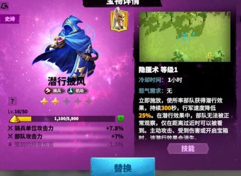 比如骑兵,优先选择的潜行披风,持续时间长达5分钟的隐身时间,让你有充足的时间去扫田,偷人,普通玩家偷大佬的远程也能做到一换一。