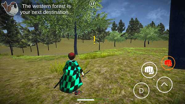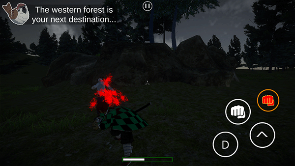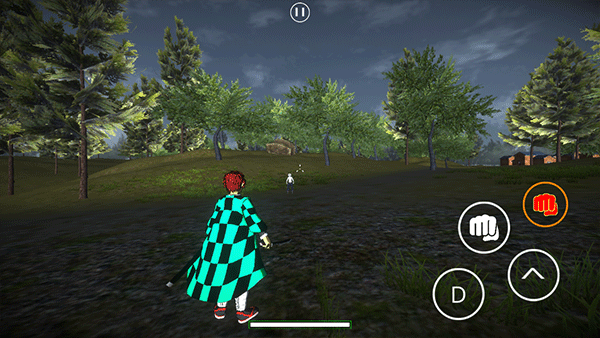 2、进入游戏后,玩家将控制着炭治郎与敌方进行战斗,D键控制翻滚,向上键控制跳跃,还有红色的攻击键为技能;