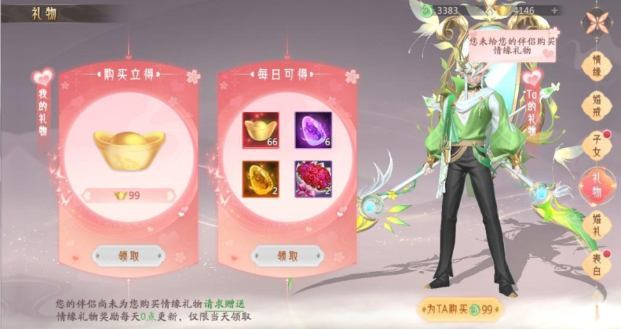 消耗仙玉可为情缘购买情缘礼物,购买后本人可获得元宝奖励,情缘可以每日领取情缘礼物奖励。
