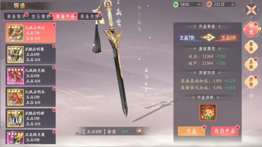 人物达到220级开启装备升品,消耗装备升品石可提升装备的品阶,消耗装备突破石可突破至下一阶段。当装备的不同部位提升到同一品阶时,根据同一品阶部位的数量,即可激活对应的部位品质套装属性。